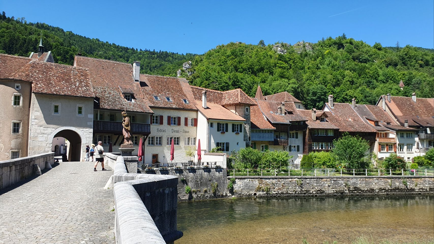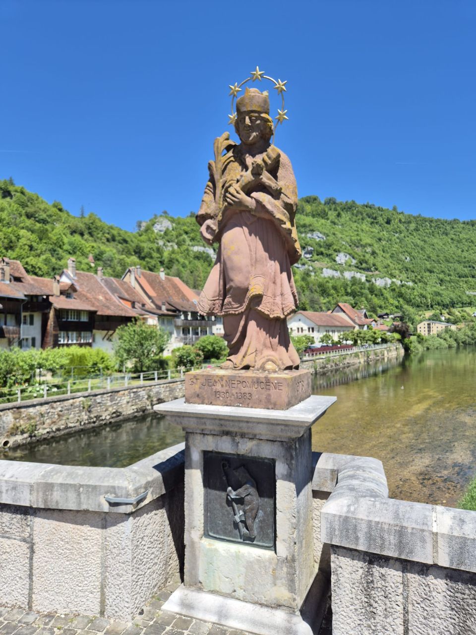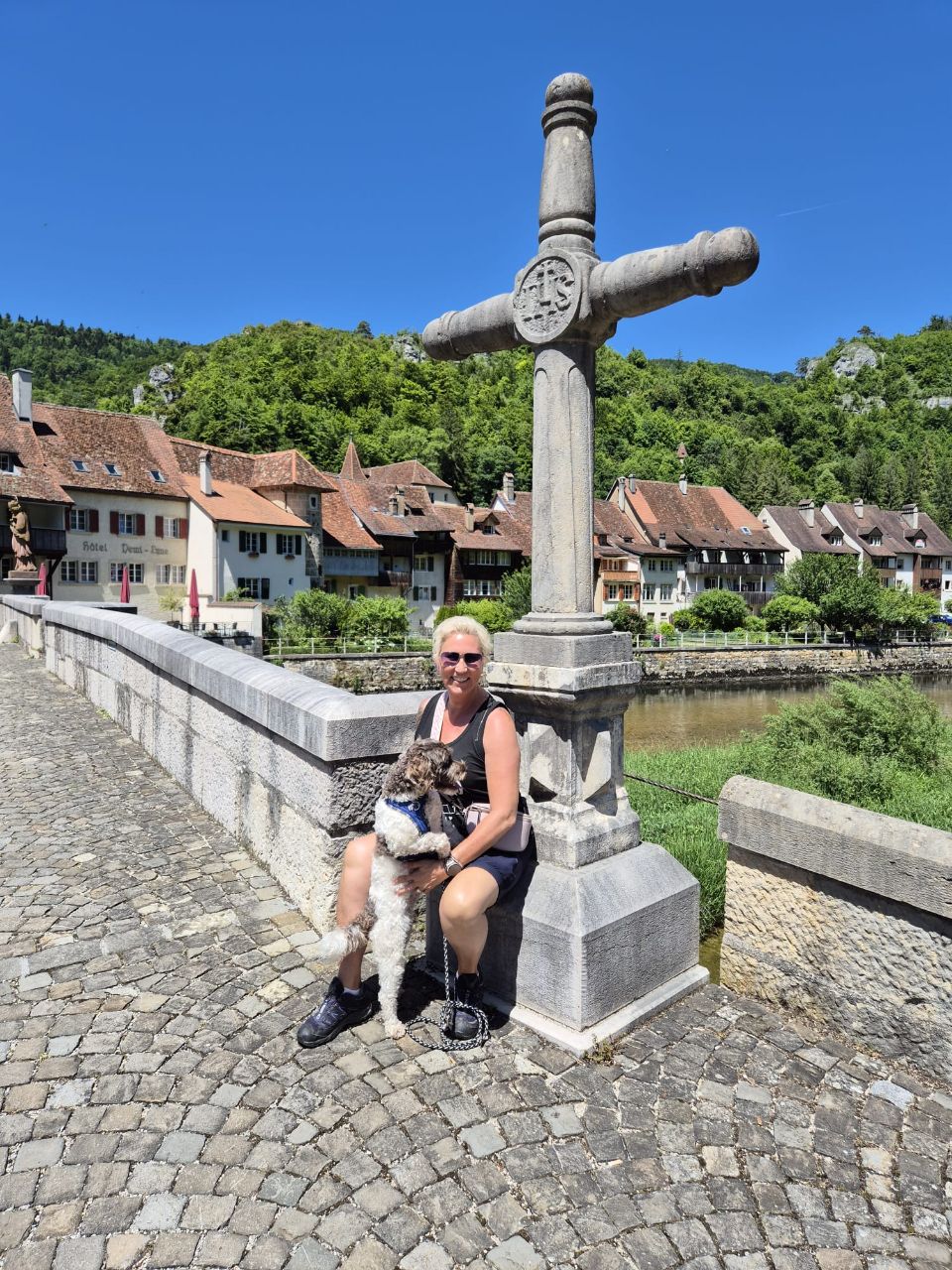Saint Ursanne ist ein hübsches Städtchen mit einer grossen Stiftskirche. Wir machen uns auf den Weg, um den Platz des Eremiten Ursinius aufzusuchen. Der aus Irland stammende Mönch lebte als Einsiedler in Abgeschiedenheit in einer Höhle oberhalb des Flusses Doubs. Eine schöne Aussicht erwartete uns. Auf dem Rückweg konnten wir einem Imker bei seiner Arbeit am Bienenstock zuschauen. Die Sonne, die durch den Wald und auf das Moos schien, liess Bruno & Yuna in einer grünen Lichttäuschung erscheinen. In Saint-Ursinne versorgten wir uns zuerst mit einem Glace, anschliessend mit frischen Schweizer Erdbeeren, O’Saft und Trockenfutter für Yuna, welches wir leider zuhause vergessen haben.