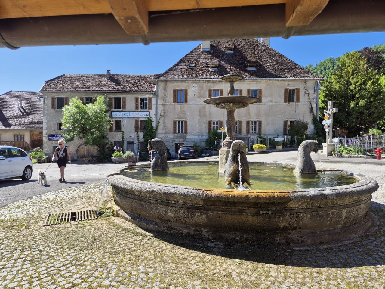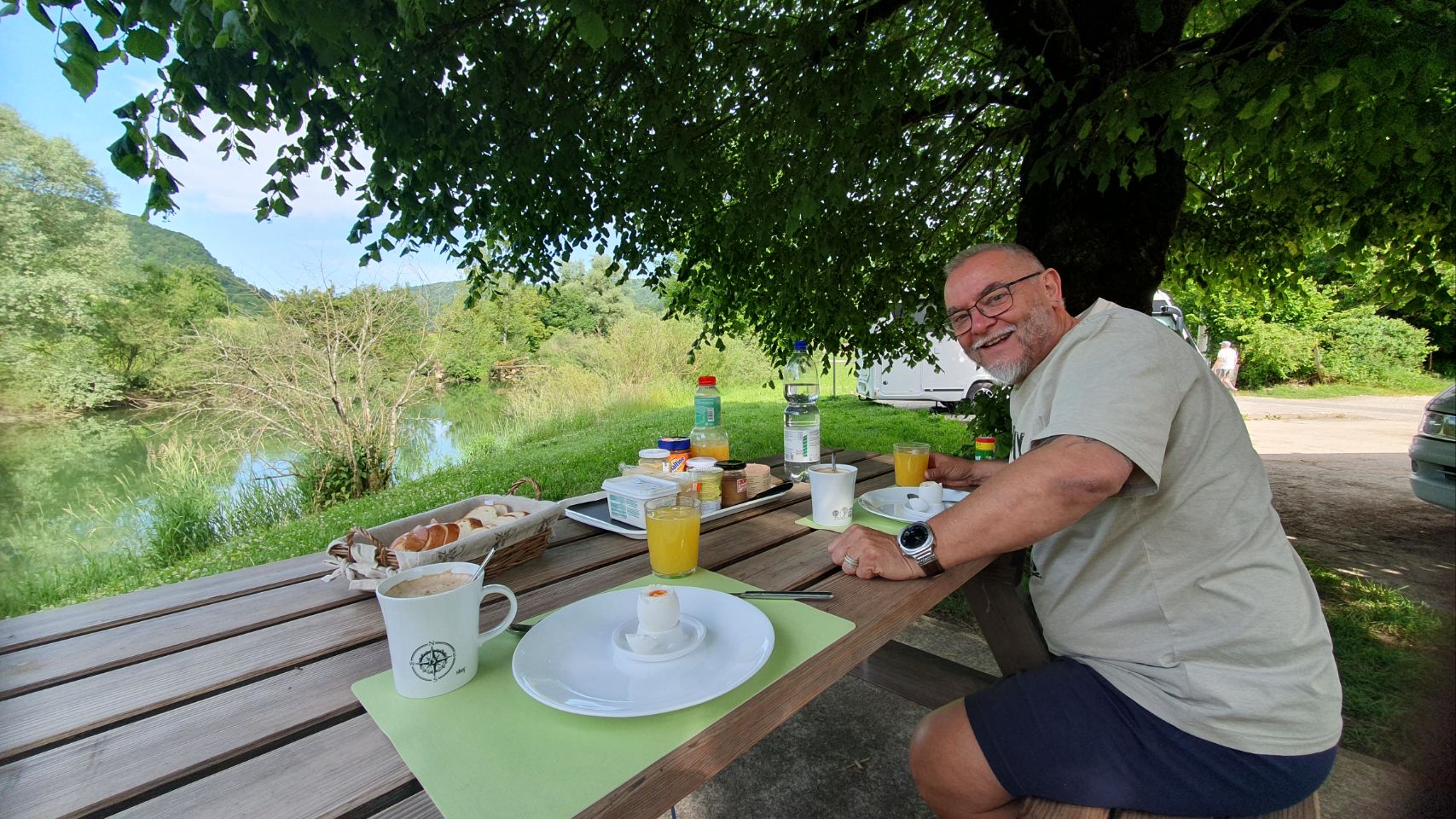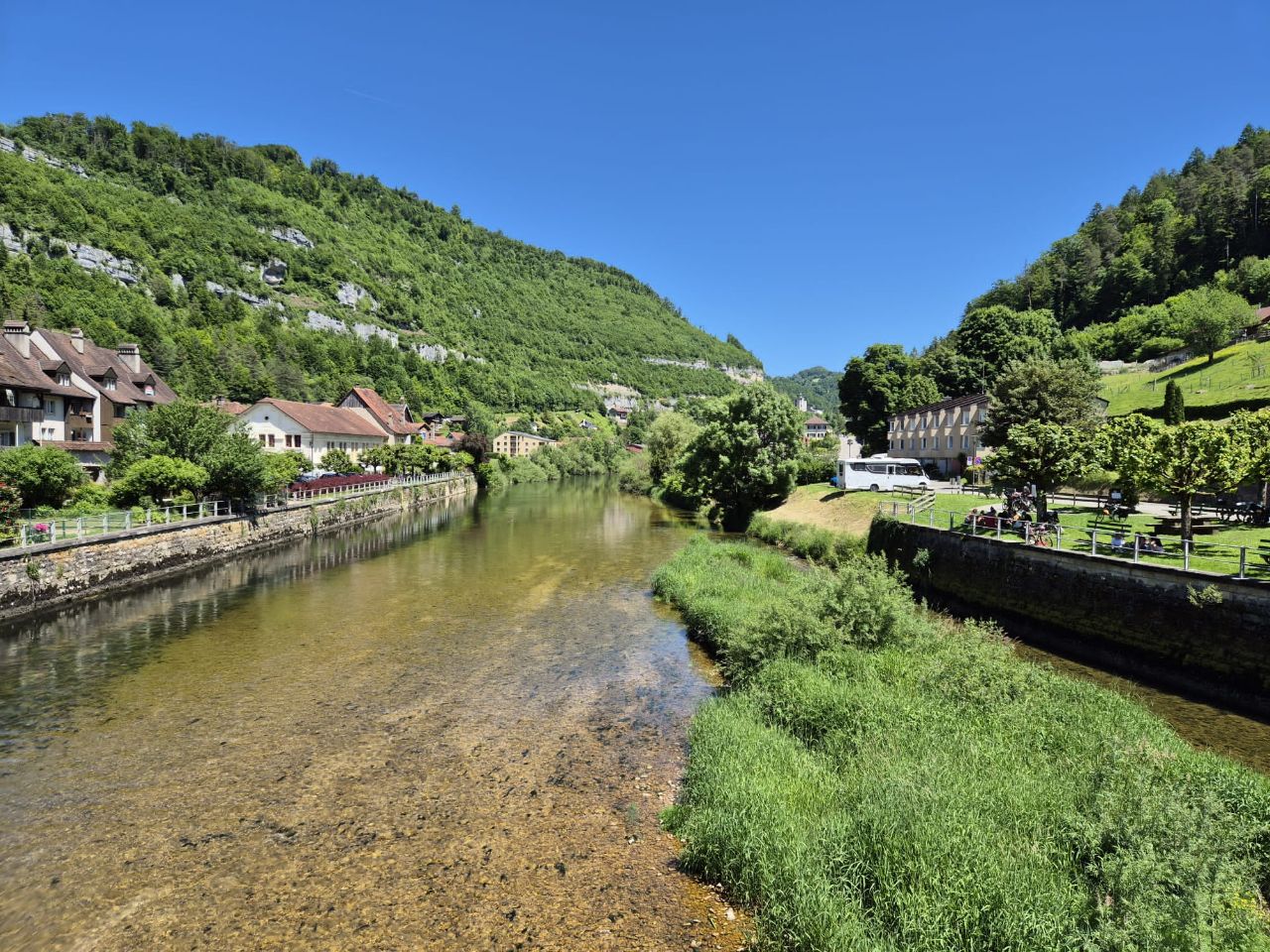 Während der Weiterfahrt suchten wir ein Plätzchen zum Übernachten. In einem kleinen Dörfchen stiessen wir auf einen schönen Stellplatz in Vaufrey, Frankreich, direkt an der Doubs gelegen. Der Stellplatz ist ideal für Camper jeglicher Grösse. Interessant war ein umgebautes Feuerwehrauto und kamen mit den Besitzern ins Gespräch. Sie erklärten, wie der Umbau erfolgte und dass sie demnächt mit ihrem Fahrzeug Südamerika bereisen werden. Es ging nicht lange und wir sassen gemütlich bei einem feinen Weisswein zusammen und tauschten uns mit gegeseitigen Erfahrungen aus. Das Abendessen und das Frühstück genossen wir draussen an der Doubs. Herrlich!!!