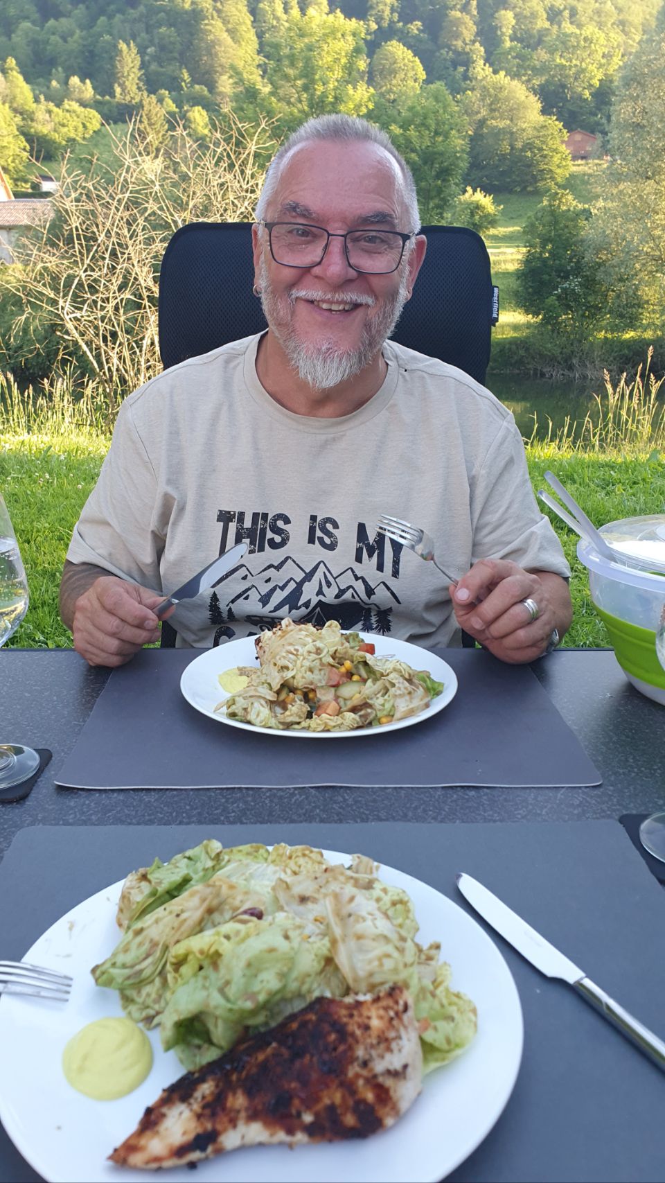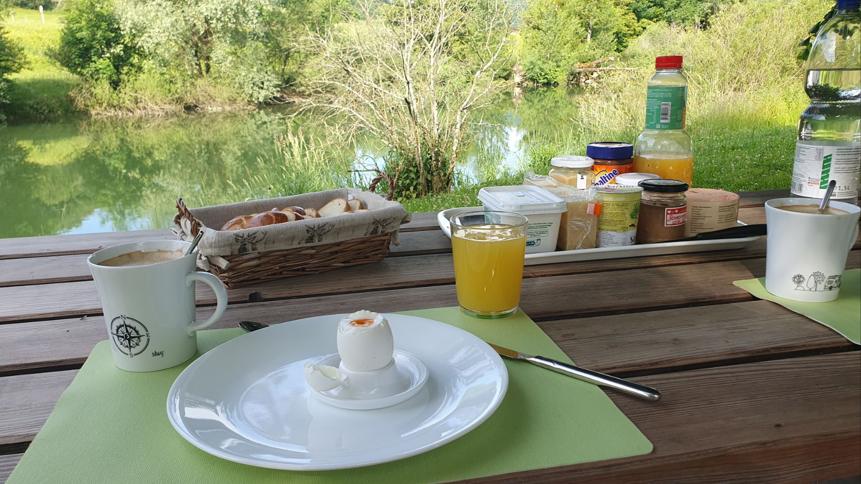 Zu viert genossen wir das herrliche Wetter, plauderten über zukünftige und vergangene Reisen und selbstverständlich mussten wir auch die Temperatur des Hallwilersees testen 🏊♀️. Auch Yuna 🐶 wagte sich ins Wasser und freute sich über eine angenehme Erfrischung. Heute Abend stand Stef am Grill (gestern Bruno) und mit den leckeren Salaten von Germaine verwöhnten wir unsere Gaumen 😋. Bis spät in die Nacht hinein und trotz einem kurzen Gewitter ⛈️☔️ genossen wir den gemütlichen Sommerabend sehr.