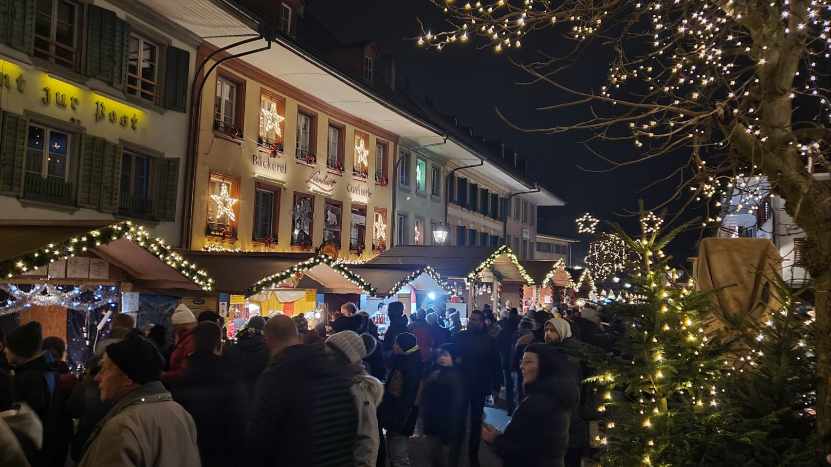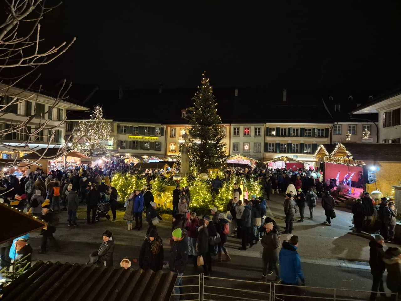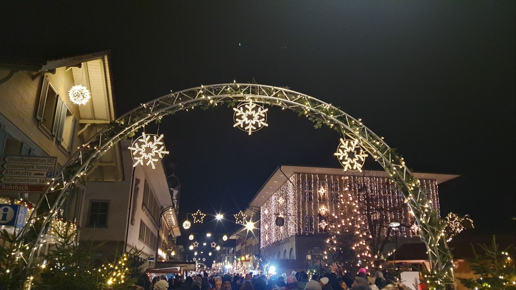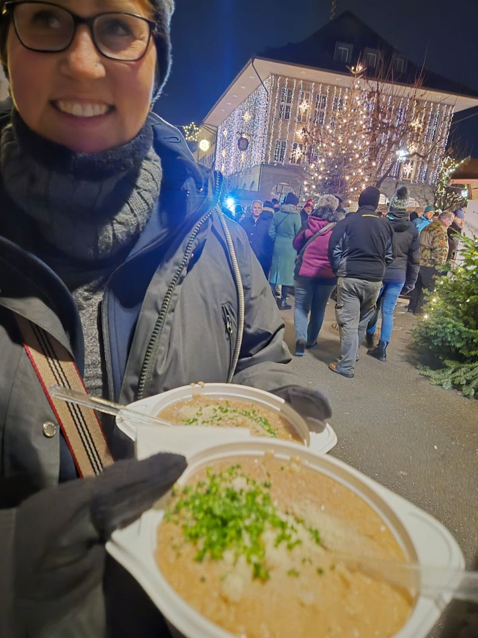 Besuch des Weihnachtsmarkts z’Hottu… Wir parkten Beni auf dem Stellplatz „am Spycherhandwerk“, versorgten Yuna 🐶 mit Futter & Wasser und machten uns zu Fuss auf Richtung Dorfzentrum (ca. 20 Min. Fussmarsch). Da uns schon seit einiger Zeit schon der Magen knurrte, kam uns der erste Verpflegungs-Stand am Weihnachtsmarkt gerade recht. Der heisse Risotto schmeckte köstlich 😋. Das Schöne am Weihnachtmarkt war, dass viel regionales Handwerk angeboten wurde. Es gab keinen Stand mit asiatischem Ramsch, südamerikanischen Ponchos etc. Die angebotenen Strickwaren kamen ausschliesslich aus Huttwil und Umgebung. Unter anderem wurde auch Kamelstrickware angeboten, die vom Kamel-Bauer „am Spycherhandwerk“ – unserem Stellplatzbetreiber – stammten. Noch beschwingt von der Musik der Jungs von „The Rock’in Rudolphs“ gab es dann später den fast schon obligatorischen Glühwein (den ich Bruno zwar etwas aufgedrängt habe 😉🙈). Schön war’s! Freudig über unsere Rückkehr kurz nach 21.00 Uhr wurden wir von Mademoiselle Yuna begrüsst, die in der Zwischenzeit schlafend im warmen WoMo wartete.