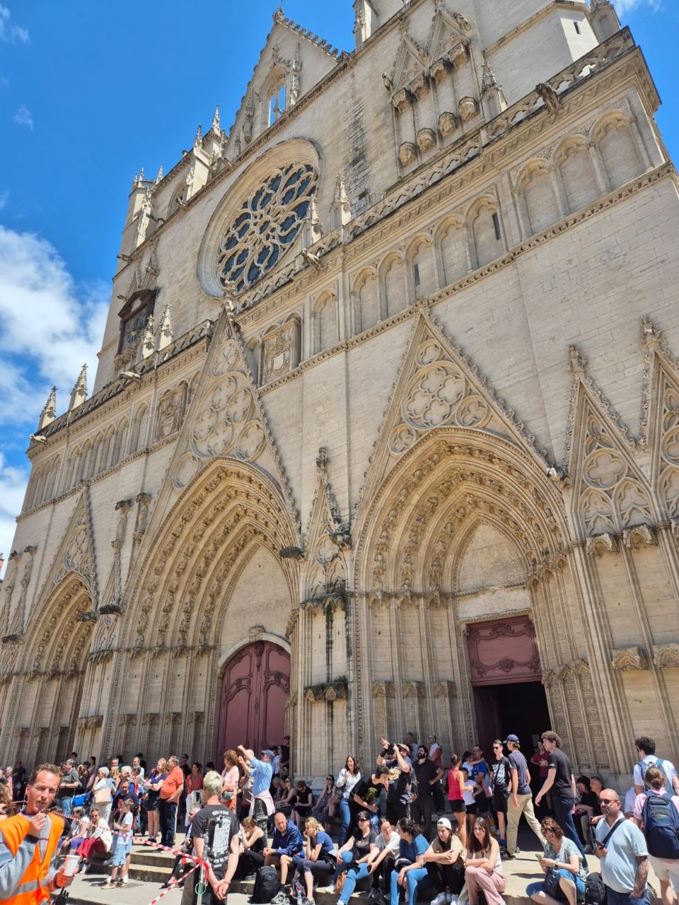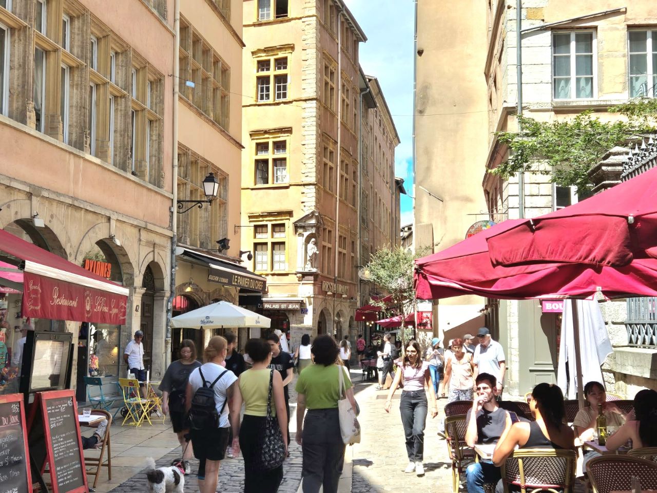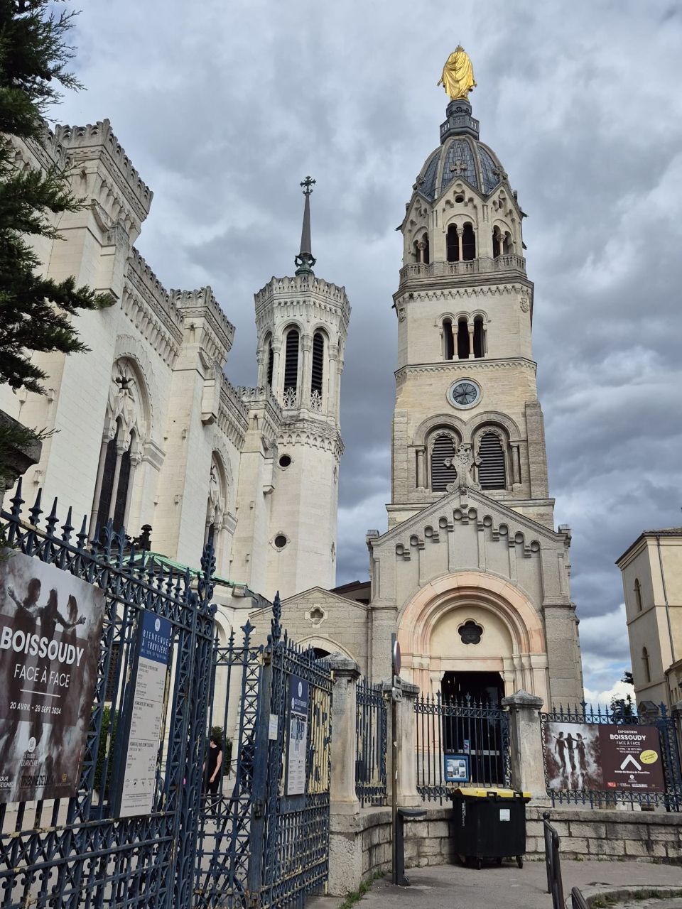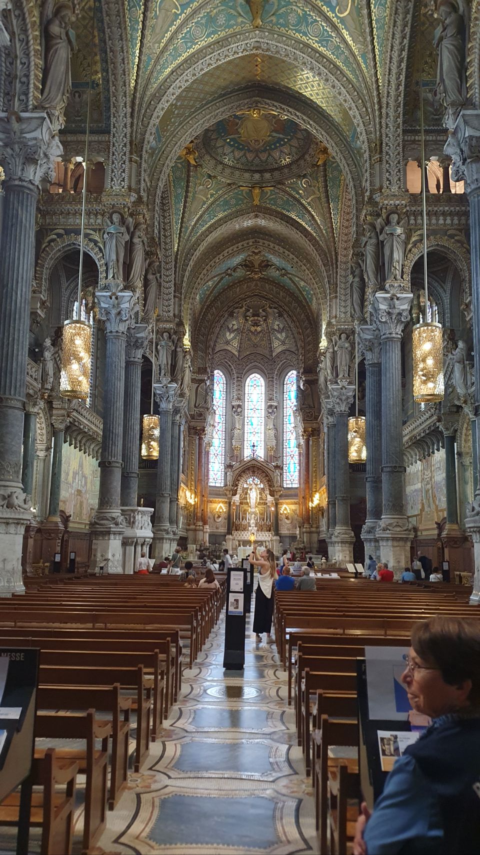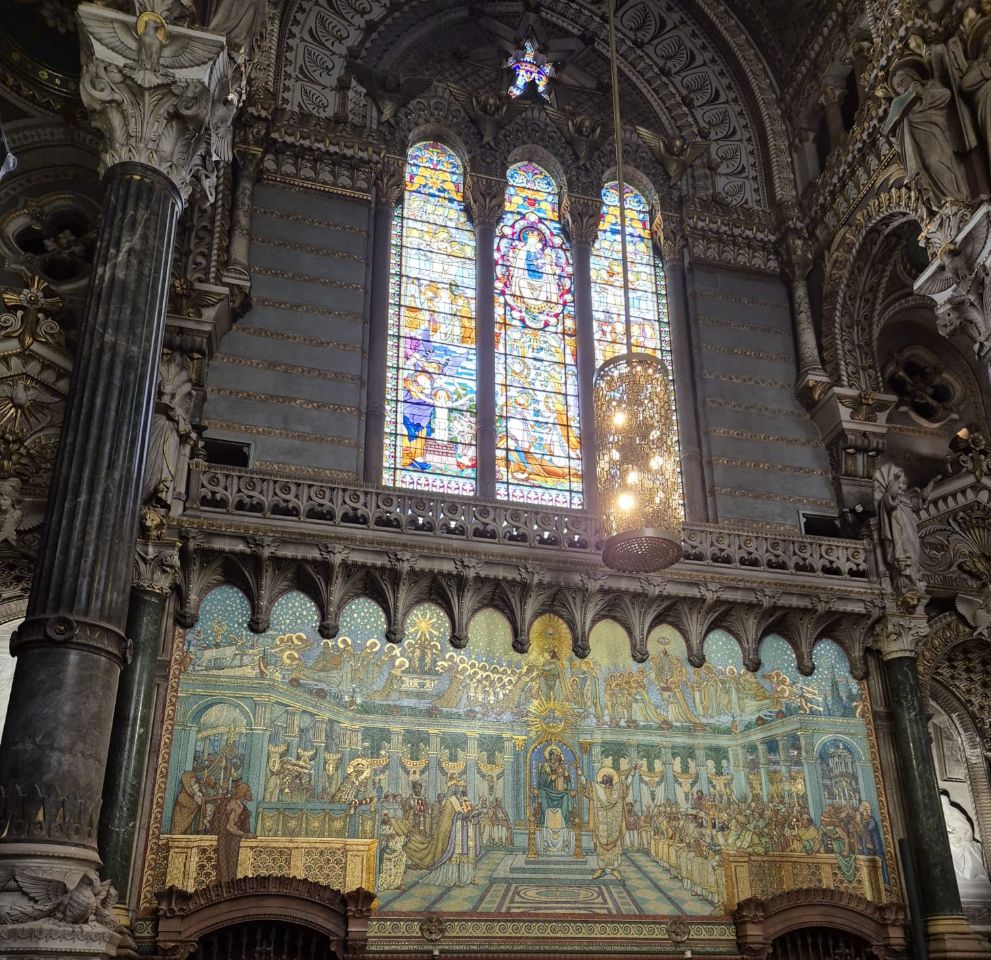 Mit Bus und Metro fuhren wir heute mitten in die Metropole der UNESCO-Stadt Lyon. Im Laufe seiner zweitausendjährigen (!) Geschichte hat sich Lyon im Stil verschiedener Epochen entwickelt. Die wunderschöne Altstadt Vieux-Lyon hat es verstanden, den Charme seiner unzähligen Strässchen und Gassen aus der Renaissance zu bewahren. Wir schlenderten durch die mit Pflastersteinen besetzten Gässchen, besuchten einige der vielen kleinen Boutiquen mit Spezialitäten aus Lyon und der Region, schauten uns die Überreste von Lugdunum an (Hauptstadt der Gallier in der römischen Kaiserzeit) und stiegen die Treppen der beiden antiken Theater hoch, die heute für div. Events genutzt werden. Wir durften Zeugen einer Filmaufnahme sein und liessen es uns nicht nehmen, auf der Terrasse eines Restaurants dem Geschehen zuzuschauen. Anhand der Kostüme, der Requisiten und Automobilen dürfte es sich vermutlich um einen Film in den 30er/40er-Jahren handeln. Dieselbe Szene wurde wieder und wieder gespielt, bis sie „im Kasten“ war. Wir haben nur einen Teil der unzähligen Sehenswürdigkeiten besuchen können, aber das reichte, um unsere Füsse platt zu laufen. Mit der Standseilbahn ging’s dann hinauf auf den ältesten Hügel Lyons. Uns war die Basilika Notre-Dame de Fourvière natürlich schon lange ins Auge gestochen, die oben auf dem Hügel thronte. Nun sahen wir sie direkt vor uns. Genau wie die historische Altstadt zählt sie zum UNESCO Weltkulturerbe. Der Innenraum der prächtigen Basilika ist atemberaubend, gewaltig, pompös und dekadent zugleich, insbes. wenn man bedenkt, dass auch in Lyon Menschen in Armut lebten. Aussen wie Innen zeigt sich die hohe Kunst der Architekten, der Steinhauer und den vielen anderen Künstlern, die am Bau mitwirkten. Die hohe Decke, die Säulen und Wände sind reich bemalt oder mit viel Gold, Mosaiken und Statuen verziert. Das Sonnenlicht liess die biblischen Motive der grossen Buntglasfenster hell erleuchten. Im Anschluss begaben wir uns zu Fuss hinunter zurück in die Altstadt. Aber nicht, ohne vorher von der grossen Aussichtsplattform die Stadt von oben zu betrachten. Die Aussicht war phänomenal und wir konnten weit in die Ferne blicken. Bei den vielen Restaurants war es uns nicht leicht gefallen, eine Auswahl zu treffen. Schliesslich fanden wir ein gemütliches Plätzchen für unser Abendessen. Auch Yuna wurde ungefragt eine Schale Wasser serviert. Mit vollem Magen (eine Crépe Praliné durfte am Schluss nicht fehlen) und vielen Eindrücken fuhren wir wieder mit den ÖV zum Campingplatz zurück. An die geschichtlich Interessierten: Die Stadt wurde vor mehr als 2.000 Jahren von den alten Römern gegründet. Damals trug sie den Namen Lugdunum, was „Festung des Lugus“ bedeutet. Lugus war ein Gott der Kelten, die das Gebiet schon lange vor den Römern besiedelten. Im Mittelalter wurde aus Lugdunum der Stadtname Lyon.