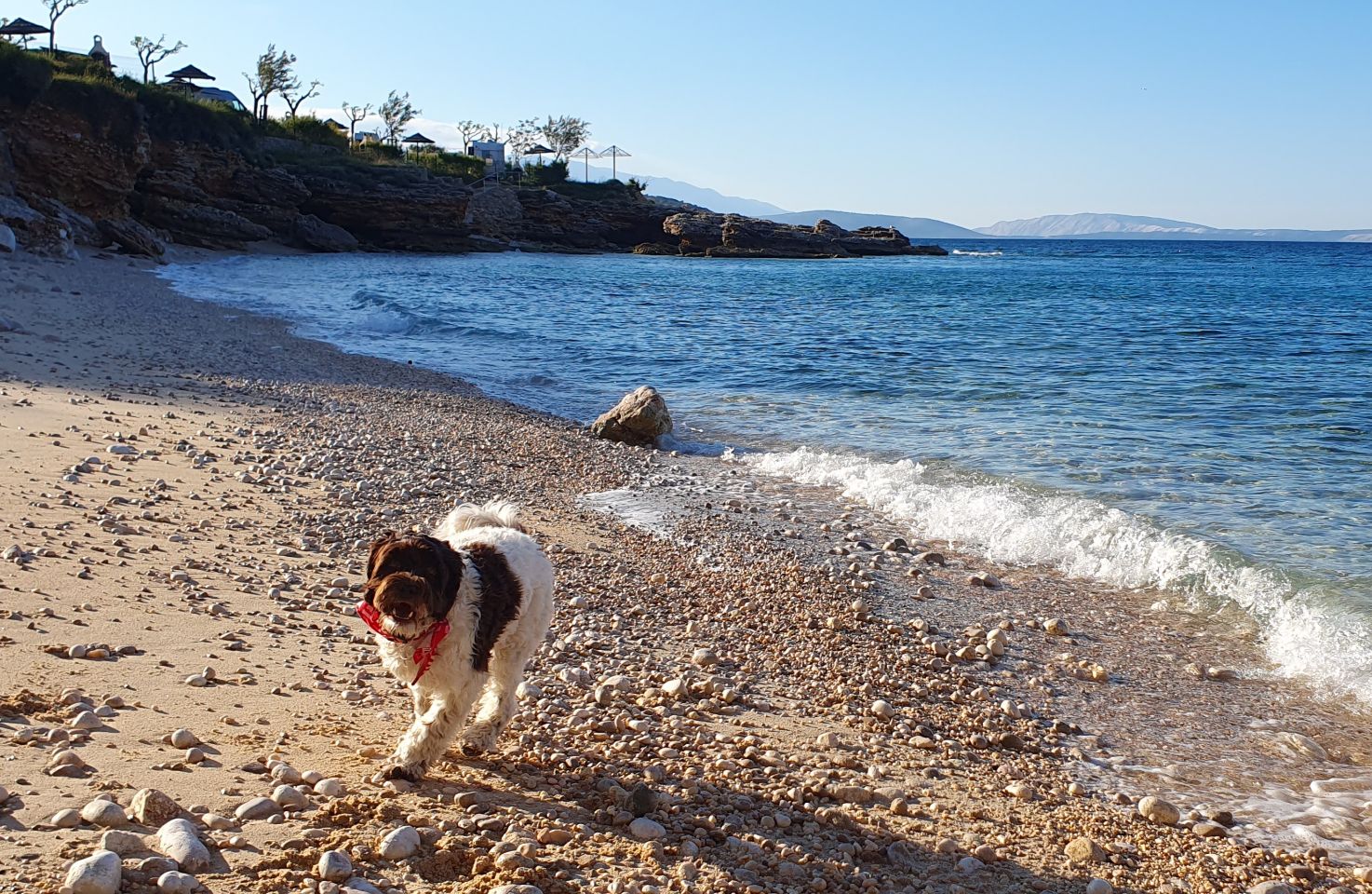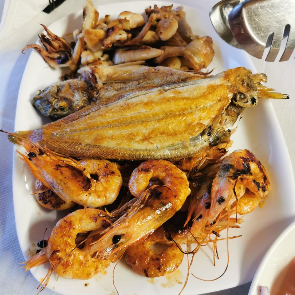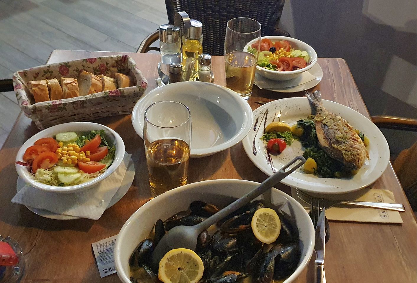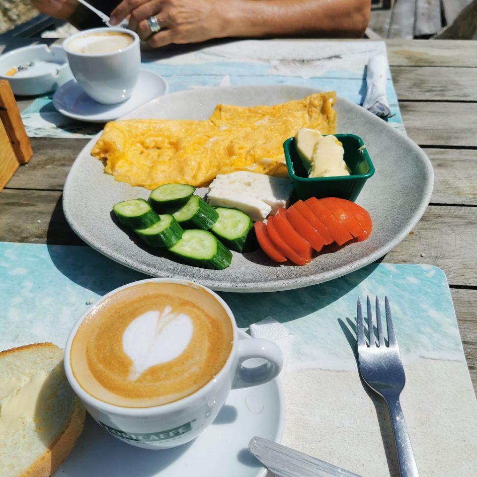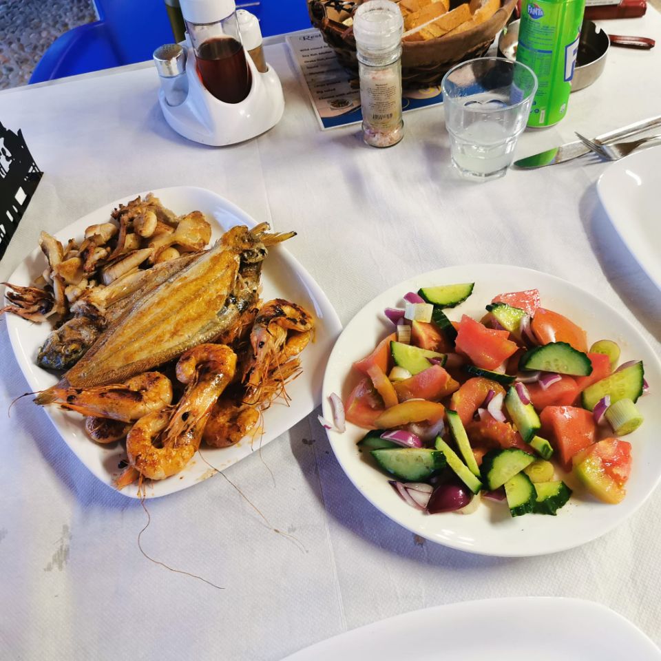 1. Heute genossen wir einmal das Frühstück auf der Insel. Einmal eine Portion Salziges mit Omelette, Tomaten- und Gurkenscheiben, Geisskäse (eine Art Feta) und einmal die süsse Variante mit Honig, Erdbeerkonfi, Nutella und ebenfalls Gurken- und Tomatenscheiben. Dazu natürlich Butter und Brot sowie insgesamt vier wunderschön zubereitete Cappuccini. Wir lernten unsere Platznachbarn aus Deutschland mit ihren Hunden Bobby und Bruno kennen. Sehr sympathische, unkomplizierte Leute, mit denen wir uns gerne austauschten. Yuna fand in Bruno und Bobby neue Freunde. Insbesondere Bobby hat es ihr angetan. Sie sprang an ihm hoch und wollte ihn zum Spielen motivieren, was ihr aber nicht so richtig gelang. Bobby litt an einem Hüftproblem, war daher etwas eingeschränkt und konnte nicht so herumbalgen. Bobby – der um einiges grösser war als Yuna – liess ihre Art „Liebkosungen“ gutmütig über sich ergehen. Auch am Abend hatten wir keine grosse Lust zu Kochen. Und wenn wir schon mal am Meer sind, wollten wir auch etwas daraus essen. Als wir zum Inselrestaurant aufbrachen, kamen uns unsere Nachbarn entgegen. Sie empfahlen uns das nahe gelegene Fischrestaurant, von welchem sie gerade zurückkamen. Wir entschieden uns, dieses Fischrestaurant aufzusuchen und wurden nicht enttäuscht! Wir bestellten einen grossen Salat sowie eine Platte mit drei Fischen, Scampi’s und Tintenfisch, der bereits in mundgerechte Stücke geschnitten war. Alles wurde gegrillt, weshalb die Tintenfische und Shrimp’s schön knusprig waren. Ein kleiner Wehrmutstropfen: Eigentlich wollten wir gerne noch eine Portion Frites dazu. Doch leider hatten sie keine Kartoffeln mehr in der Küche. Mmmm… ob wohl unsere Nachbarn die letzte Portion verputzt haben… 😉😅? Die fehlenden Pommes haben nichts daran geändert, um sagen zu können: Das Essen war fantastisch!!