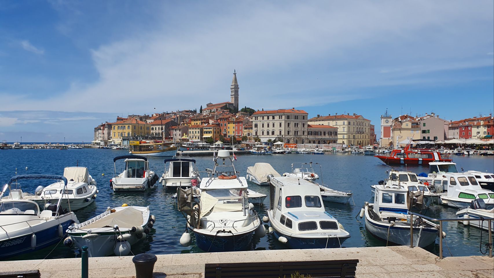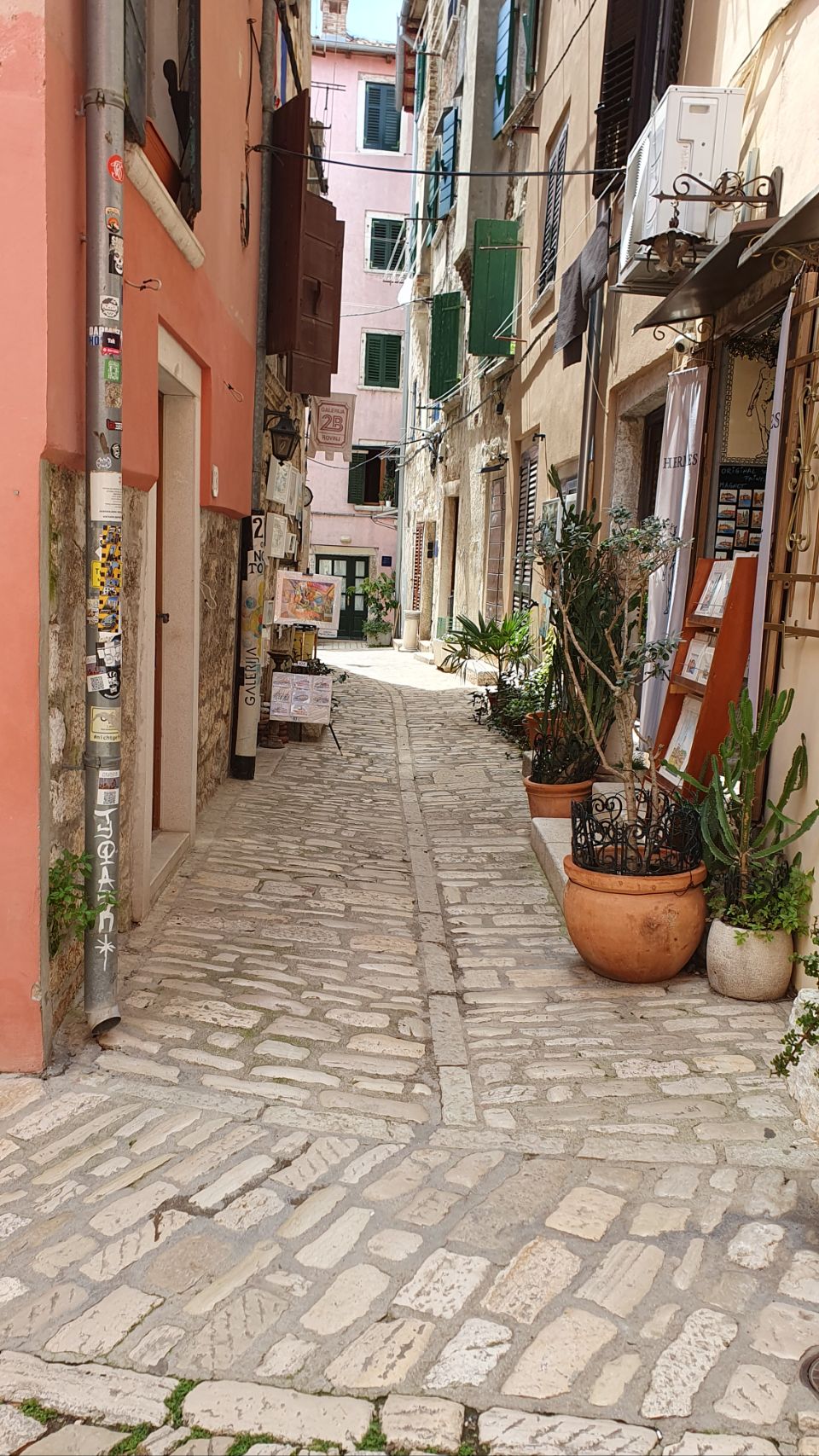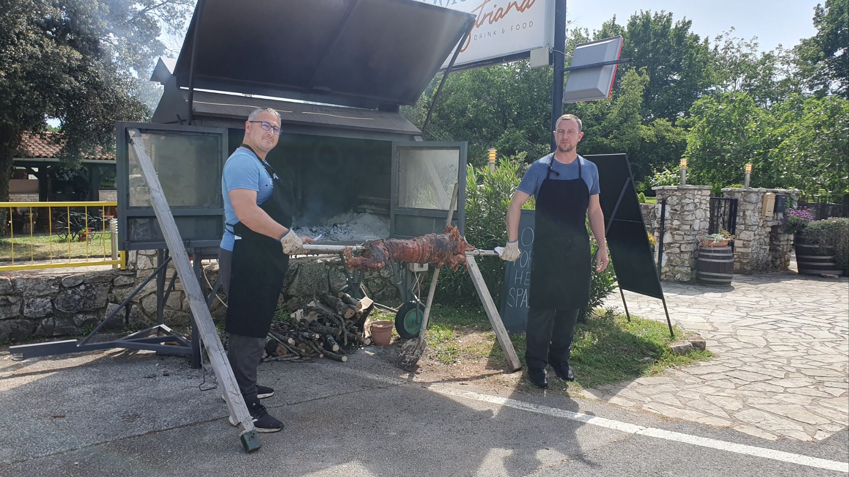 Auf der Fahrt nach Rovinj hatten wir Kontakt mit einer sehr freundlichen Marktfrau, die schmackhaftes Olivenöl und eine grosse Auswahl Eigenbrand verkaufte. Sie gab mir von diesem und jenem Schnaps zum probieren 🤪😅, während Bruno etwas weiter weg die Aussicht fotografierte. Nelina – die Marktfrau – erzählte, dass ihr Bruder für die Produktion, ihre Schwiegermutter für die Kräuter bzw. Anreicherungen der leeren Flaschen, der Etikettierung und sie selbst für den Verkauf zuständig sind. Die Produkte waren etwas teurer als in der Stadt. Der Unterschied ist aber, dass die Menschen an ihrem Stand an der Strasse von den Einnahmen leben. Wir haben uns gut eingedeckt…😂😋😜🙈 Rovinj [ˈrɔʋiɲ] (kroatisch) oder Rovigno (italienisch; istriotisch Ruvèigno) ist übrigens – für die, die es (noch) nicht kennen – eine zweisprachige Stadt in Kroatien an der Westküste der Halbinsel Istriens. Auf der Fahrt zum Stellplatz hielten wir an einem der zahlreichen Grill-Restaurants, die am Strassenrand Spanferkel grillen. Eines wurde gerade vom Grill genommen. Bruno erkundige die weitere Reisestrecke, währenddessen ich zwei Portionen dieser knunsprig-saftigen Leckerei besorgte. Bis das Ferkel zerlegt war, konnte ich bereits davon kosten und wurde dazu wiederum mit dem süssem Birnen-Honig-Schnaps verwöhnt. Der eine der beiden Brüder erzählte, dass sie ursprünglich aus Serbien kommen, aber jeder hatte eine Kroatin geheiratet. Auch hier war die Schwiegermutter aktiv: sie stellte den Honigschnaps her. Die beiden Brüder haben das Restaurant aufgebaut und betrieben dieses. Übernachtet haben wir im Dorf Bale auf einem öffentlichen Stellplatz ohne Dienstleistungsangebot (die wir eh nicht brauchen). Obwohl der Stellplatz zwischen einer Schule und einem Friedhof lag, hatten wir sehr gut geschlafen. Während wir weiterfahren konnten, durften diejenigen hinter dem Platz noch etwas länger ruhen… Friede sei mit Ihnen