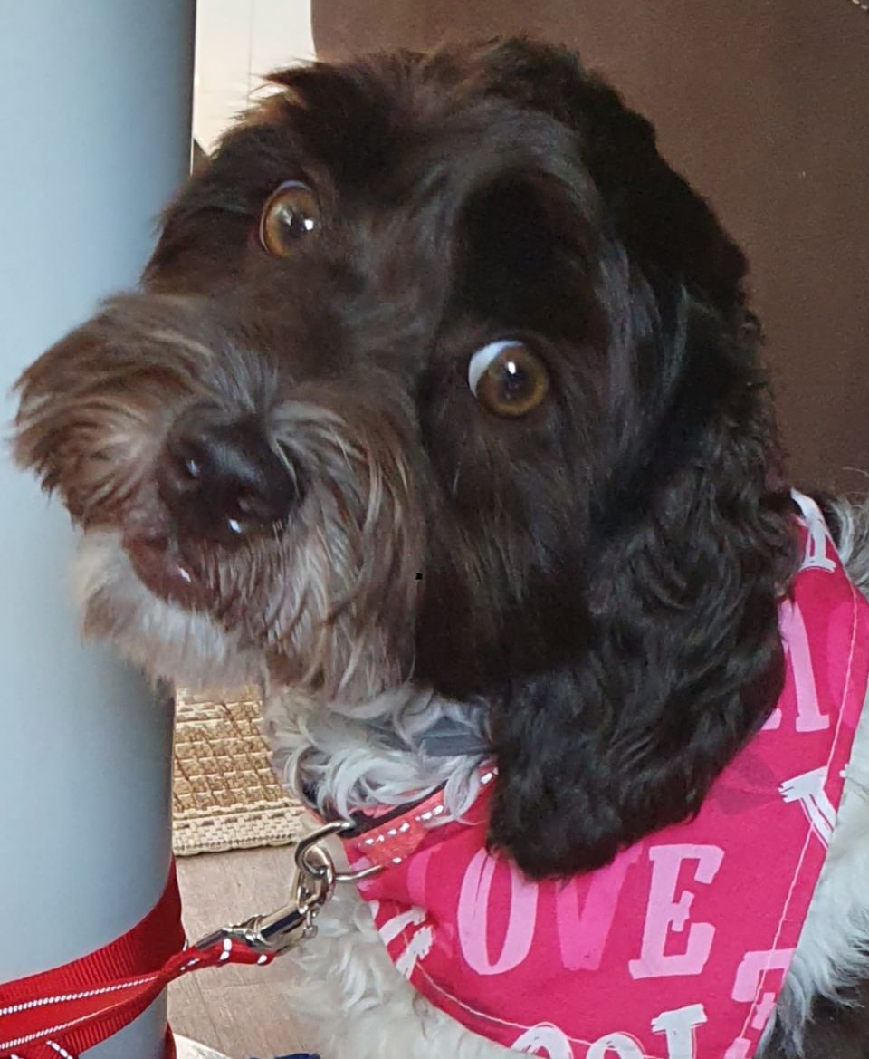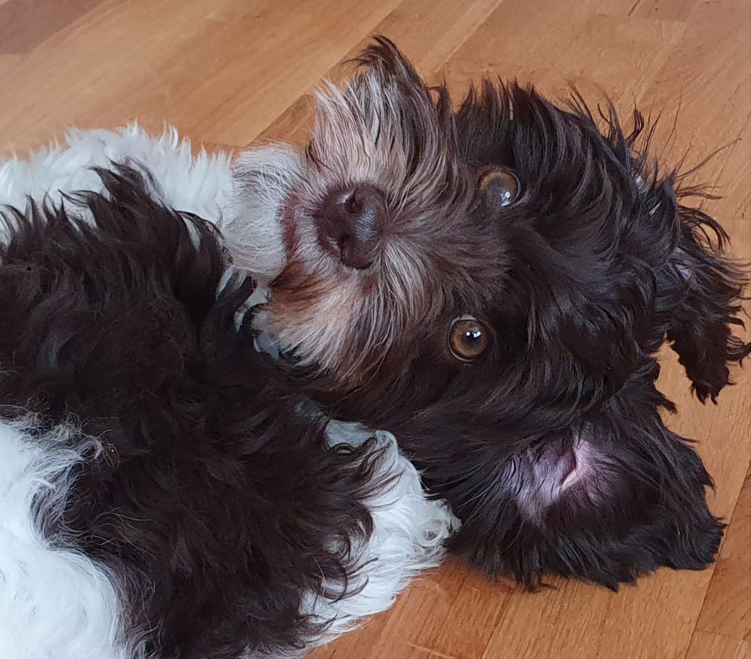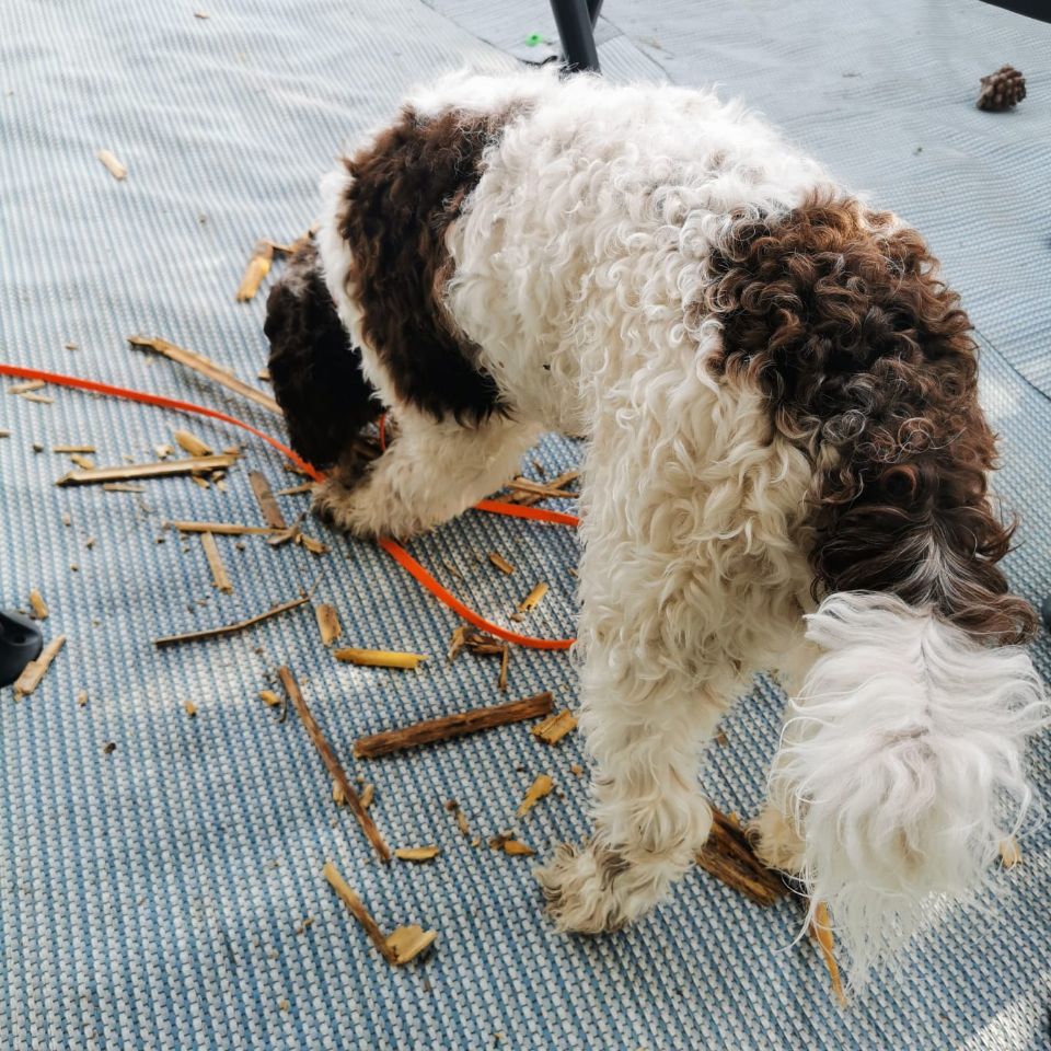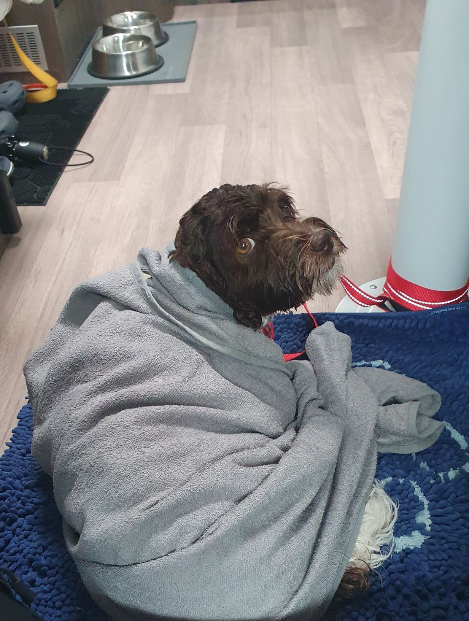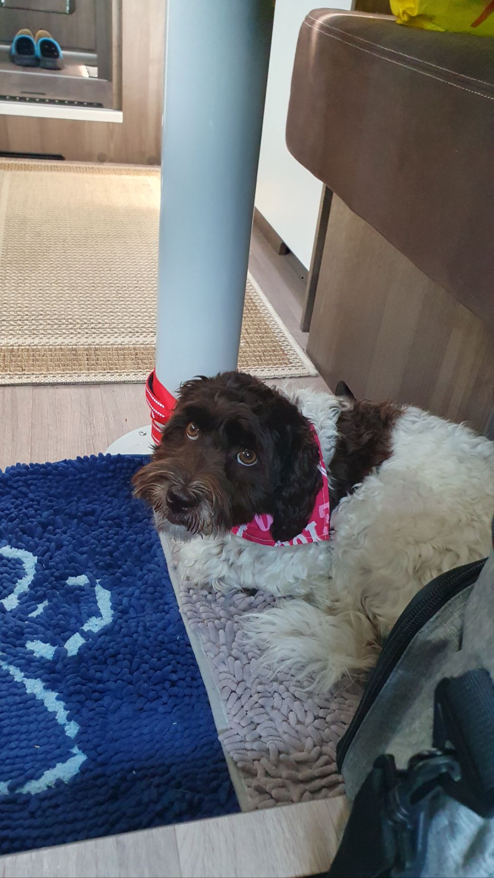 Nur ein kurzer Stopp… Bruno wollte noch etwas abchecken. Yuna war mit einer Halterung am Tischbein angebunden. Sie hatte noch ca. 40 cm Leine, um sich auf ihrem Hundeteppich gemütlich zu machen. Sie betrachtete das ganze ziemlich skeptisch. Am Ende unserer Tour ging sie ganz von selbst auf ihren Platz und wartete brav, bis wir sie festschnallen.