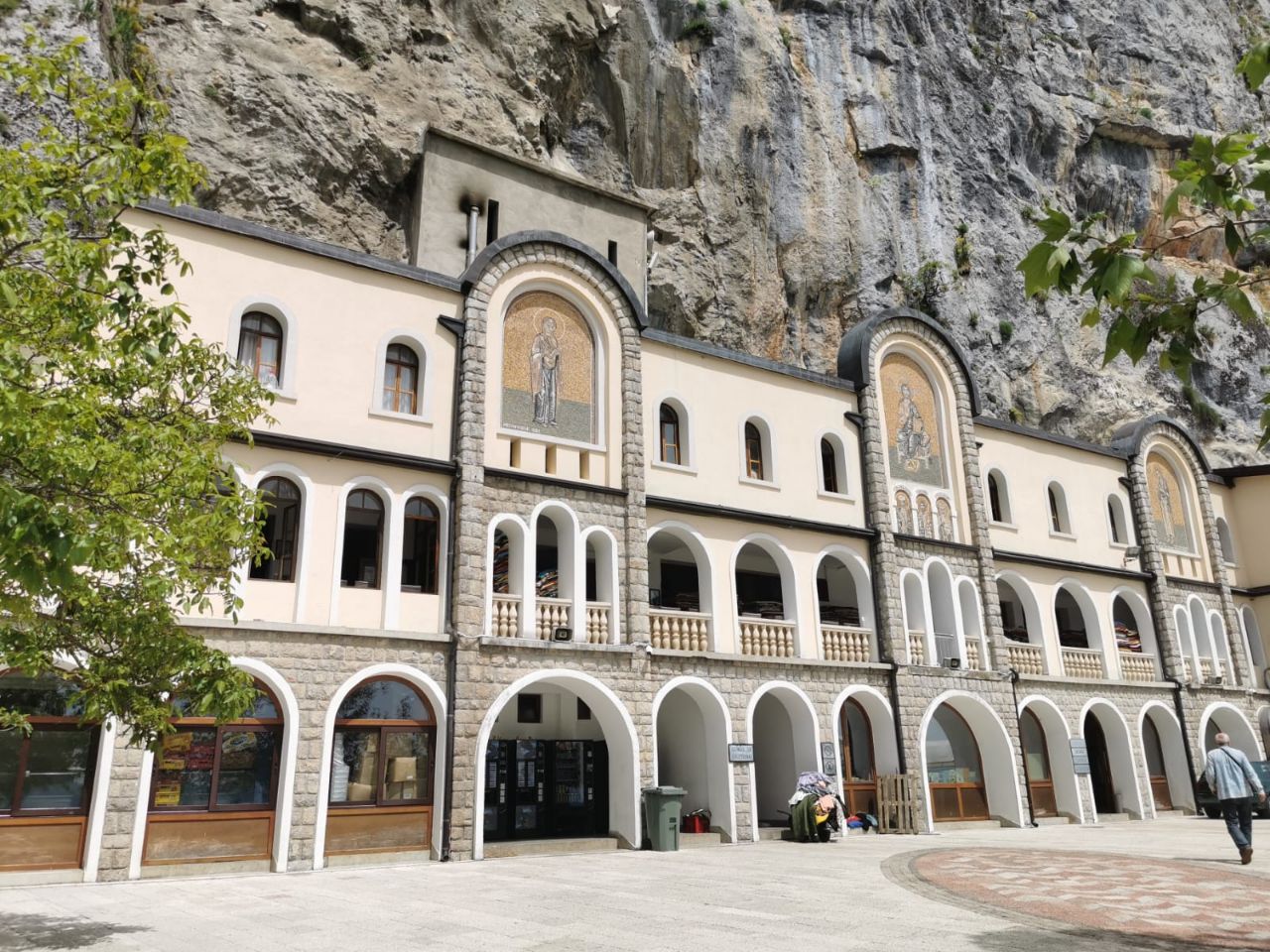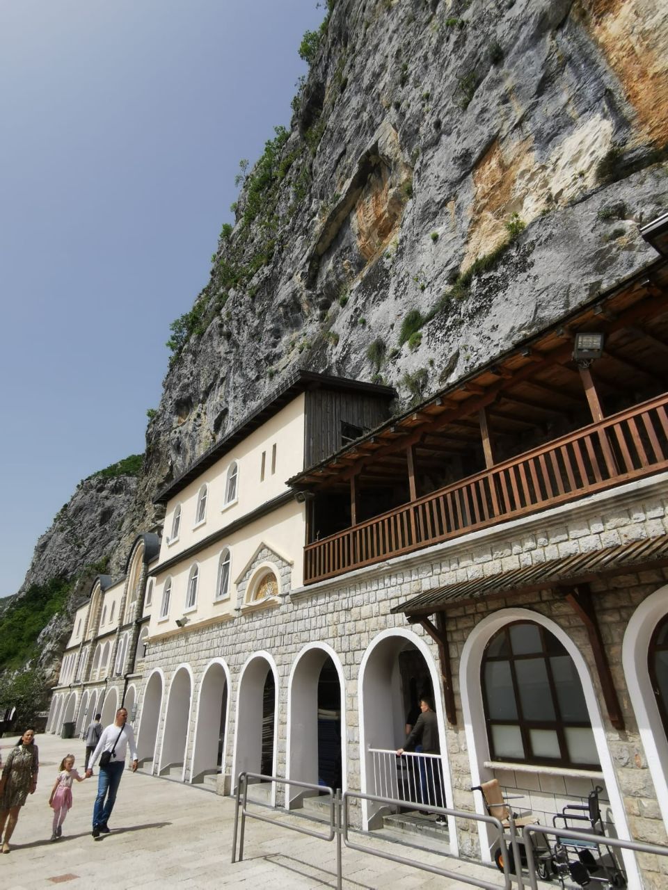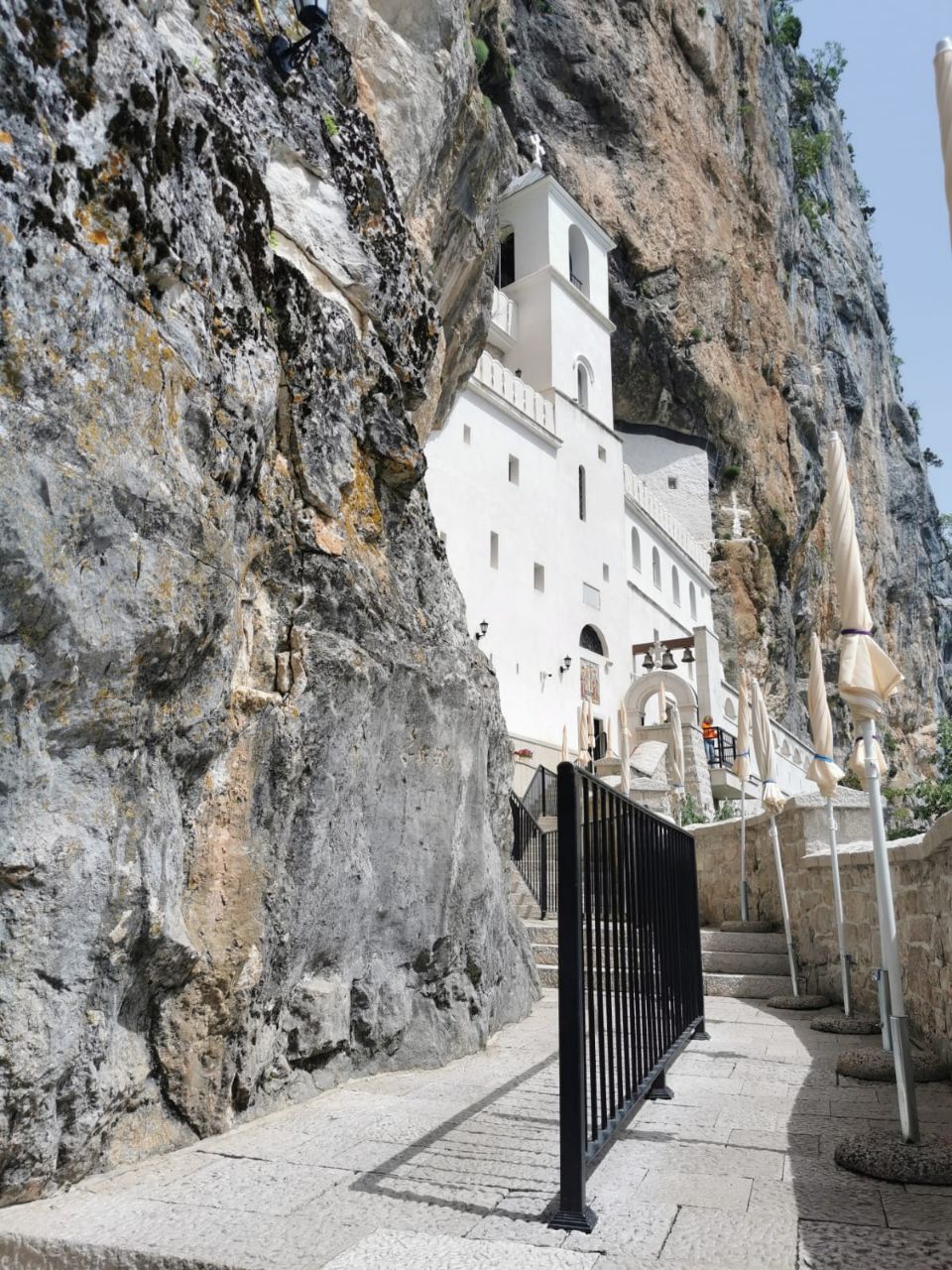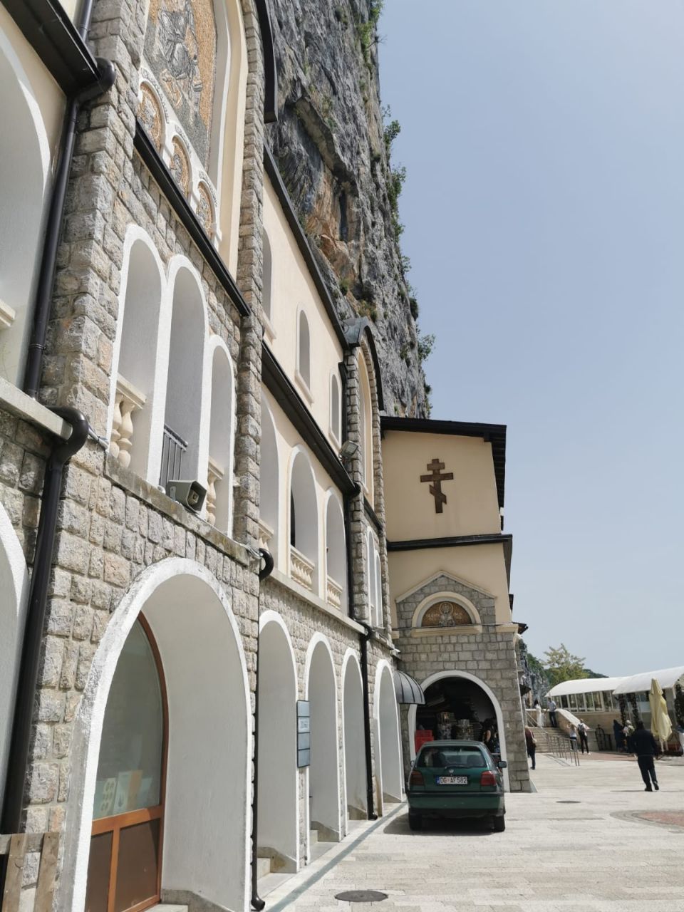 1. Bei Danilovgrad Municipality fuhren wir den Berg hoch und parkierten Benito auf dem ersten grossen Parkplatz, um das in den Fels gebauten Kloster Ostrog zu besichtigen. Etwas weiter oberhalb gab es noch einen zweiten Parkplatz mit Restaurants, Souveniers etc., wo auch ein paar WoMo’s, Reisebusse, Van’s, PW’s etc. parkten. Spätestens ab hier würden wir die Weiterfahrt mit einem WoMo nicht mehr empfehlen. Die Strasse, die zum dritten Parkplatz führte, wurde schmaler. Doch ein Reise-Van und ein PW würden sich kreuzen können, sofern die Ausweichmöglichkeiten genutzt wurden. Die folgenden Haarnadelkurven liessen Erinnerungen an die noch nicht so lange zurückliegende Zeit als Harley-Fahrende wach. Auf dem dritten Platz parkten wir unseren Quad und gingen zu Fuss weiter die zahlreichen Treppenstufen zum Kloster hinauf (wunderbar für Oberschenkel und Po… Aber an was haben wir beiden Dööfels nicht gedacht (evtl., weil wir keine Kirchgänger sind…)? Wir trugen kurze Hosen und T-Shirts! Eigentlich hätten wir es wissen müssen, dass ein Kloster – wie es dann auch auf einem Schild gefordert wurde – in angemessener Bekleidung und natürlich auch nicht mit einem Hund zu besuchen wäre… Bruno hängte sich die Jacke tief um die Hüften und schaute sich das Kloster an, während ich mit Yuna draussen wartete. Tja… man wird von mal zu mal gescheiter. Frauen, die sich besser auf den Klosterbesuch vorbereitet hatten, trugen einen Schal um die nackten Schultern ihres Trägerkleides, andere bedeckten sich auch die Haare. Das Kloster Ostrog ist ein weitbekannter Huldigungs- und Wallfahrtsort. Das Klostergebäude wurde im 17. Jahrhundert in eine grosse Felswand auf einer Höhe von 900 m ü.M. (was für uns ja eher ein Hügel wäre) eingemeisselt. Der eigentliche Aufbau begann jedoch bereits im 12. Jahrhundert. Das Kloster bewahrt die Reliquien des Heiligen Vasilije von Ostrog auf. Er galt als einen Wundertäter und seine Überreste sollen auch heute noch Wunder vollbringen und heilen können. Menschen aller Religionen und Erkrankte kommen hierher, um den Heiligen Vasilije zu huldigen und um Gesundheit zu bitten.
